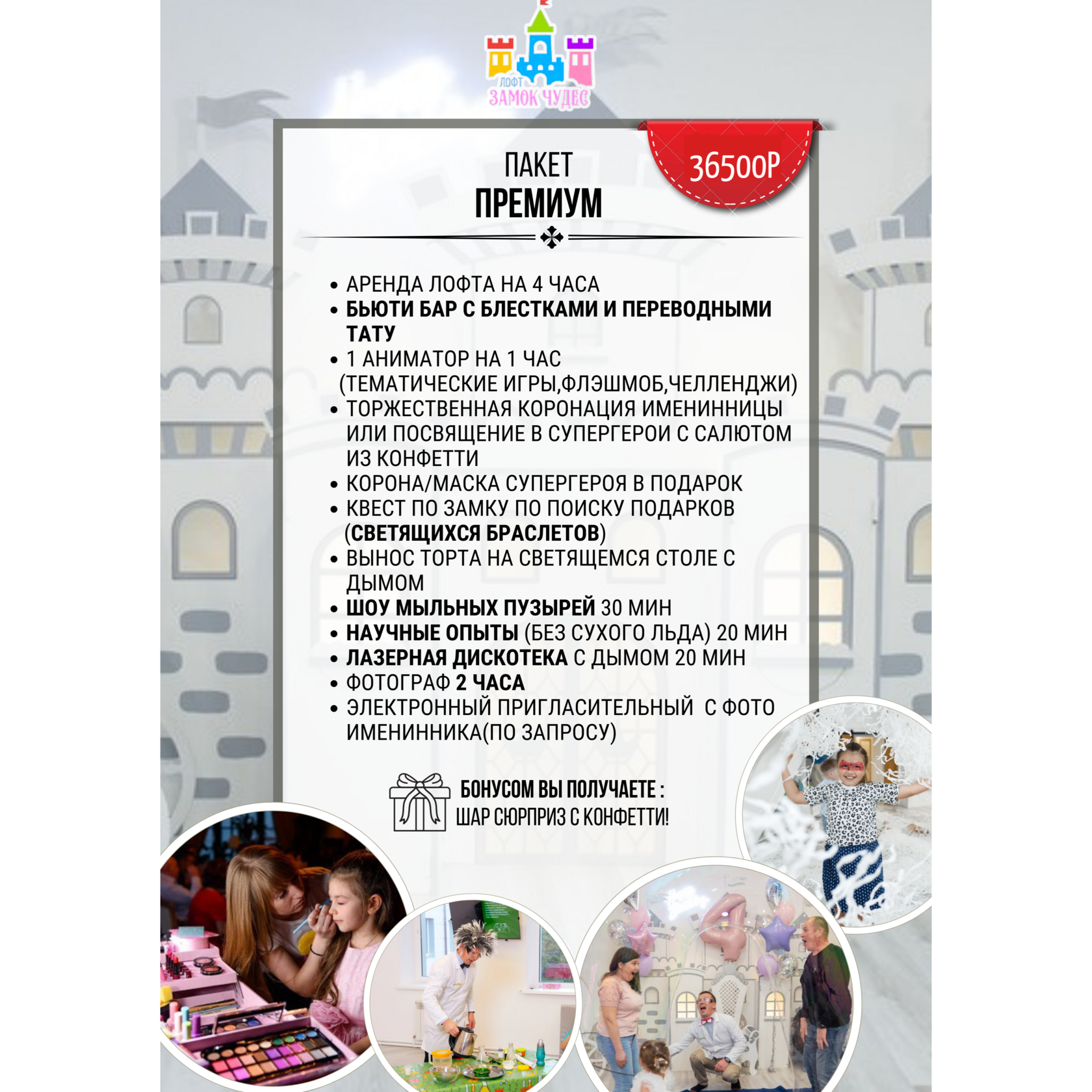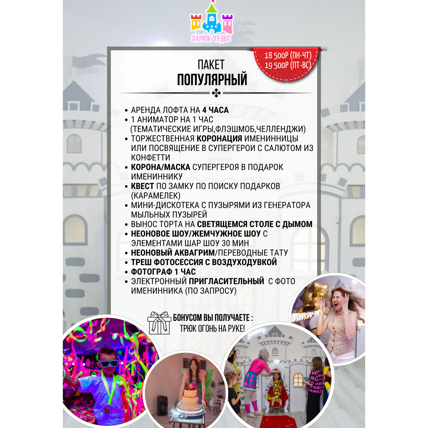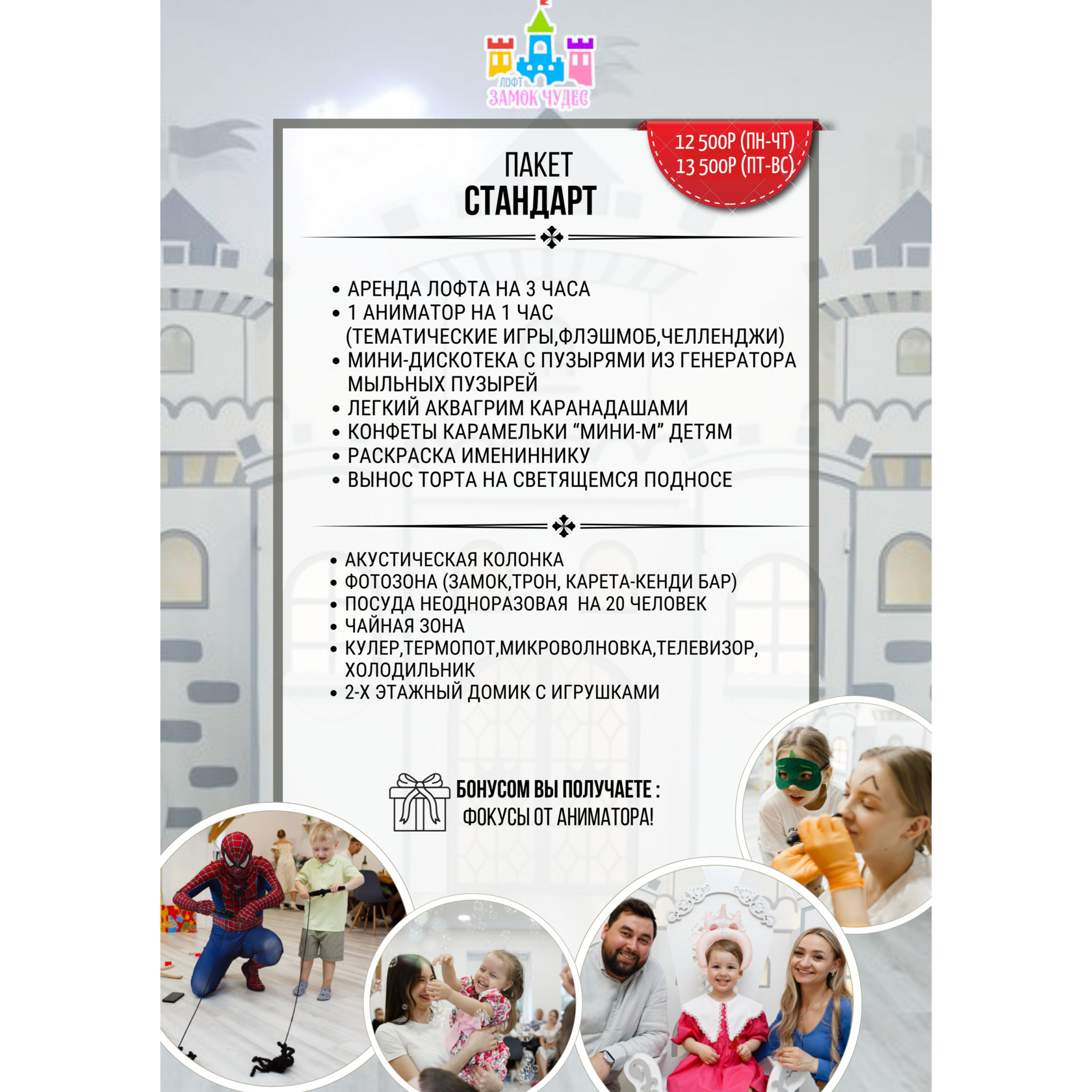 1. У нас разрешается: «Своя» еда и напитки, алкоголь в умеренных количествах, «свой» фотограф/видеограф/торт. Вы можете пригласить своего аниматора или артиста, цена минимальная в этом случае будет соответственно стоимости пакета Стандарт. Любые вышеперечисленные услуги Вы можете заказать также и у нас без дополнительных сборов.