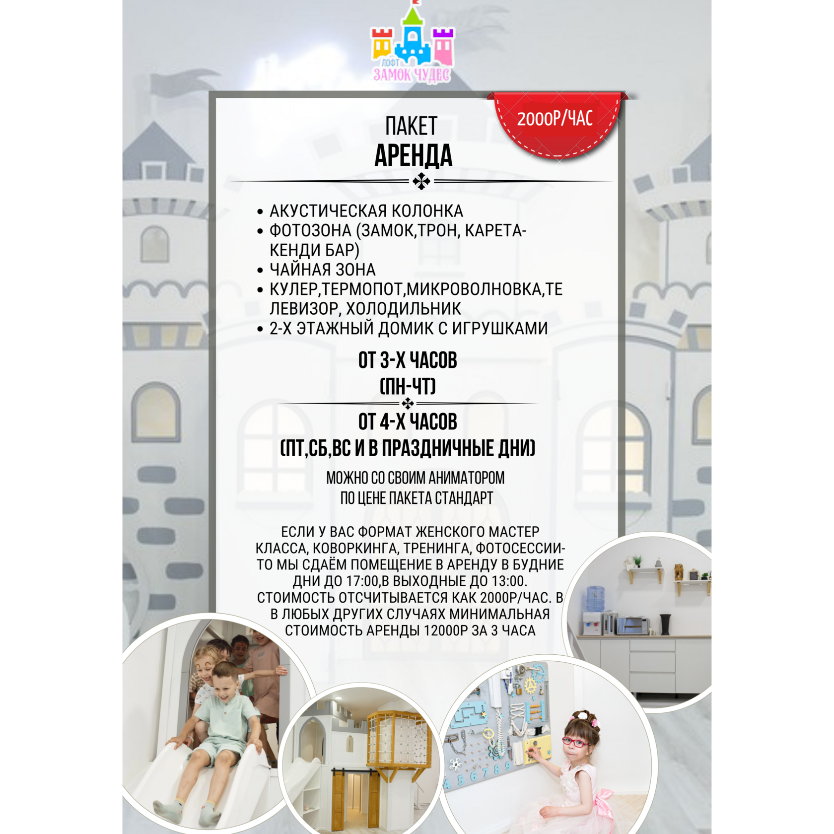 3. Все мероприятия в лофте проходят по предварительному бронировании и внесению предоплаты в размере 1000р. В случае отмены бронирования предоплата не возвращается. У вас есть возможность перенести один раз дату бронирования без удержания в течении одного месяца минимум за одну неделю. Лофт закрывается под Вас, других людей в пространстве не будет. Остаток оплаты за аренду лофта производится до начала бронирования на месте администратору.