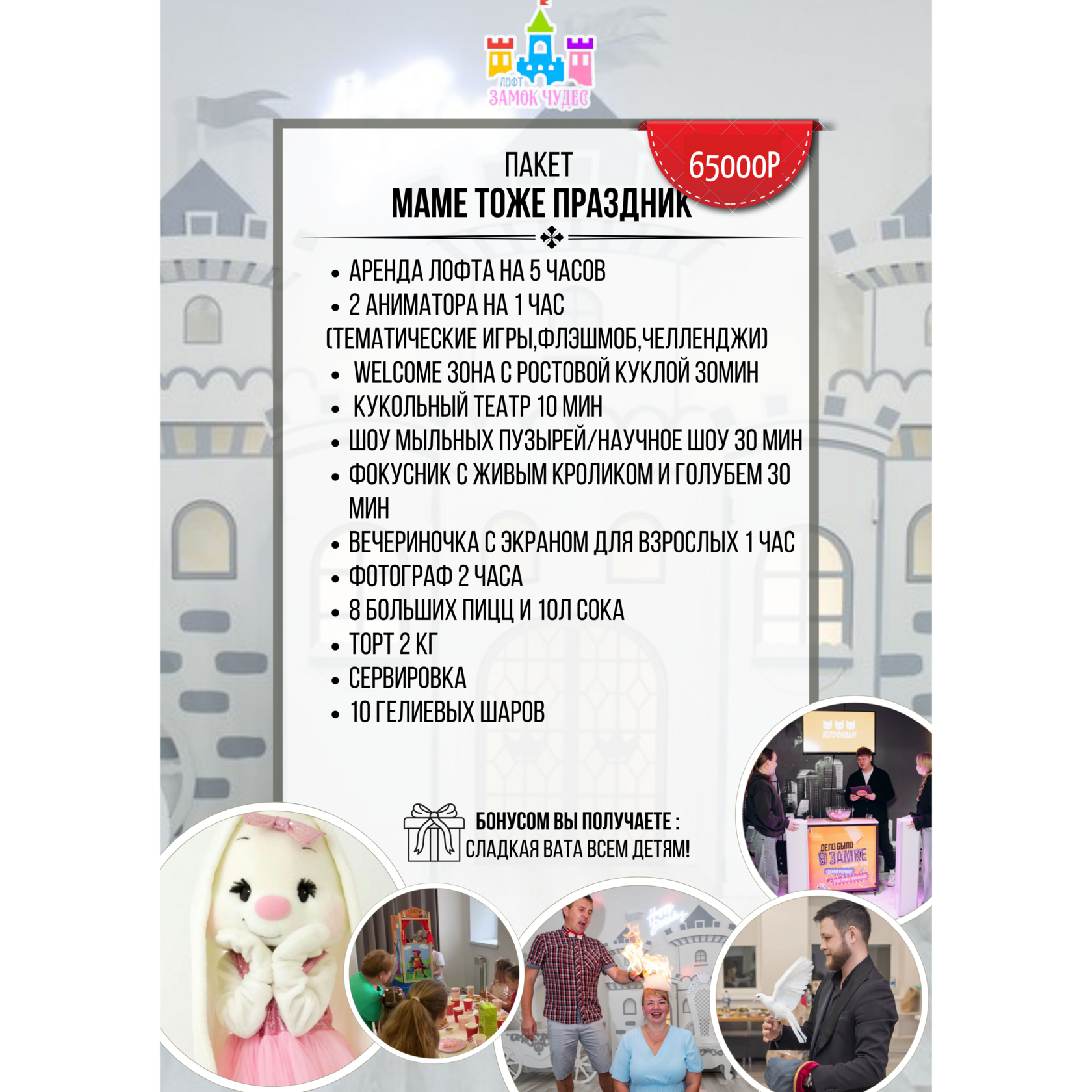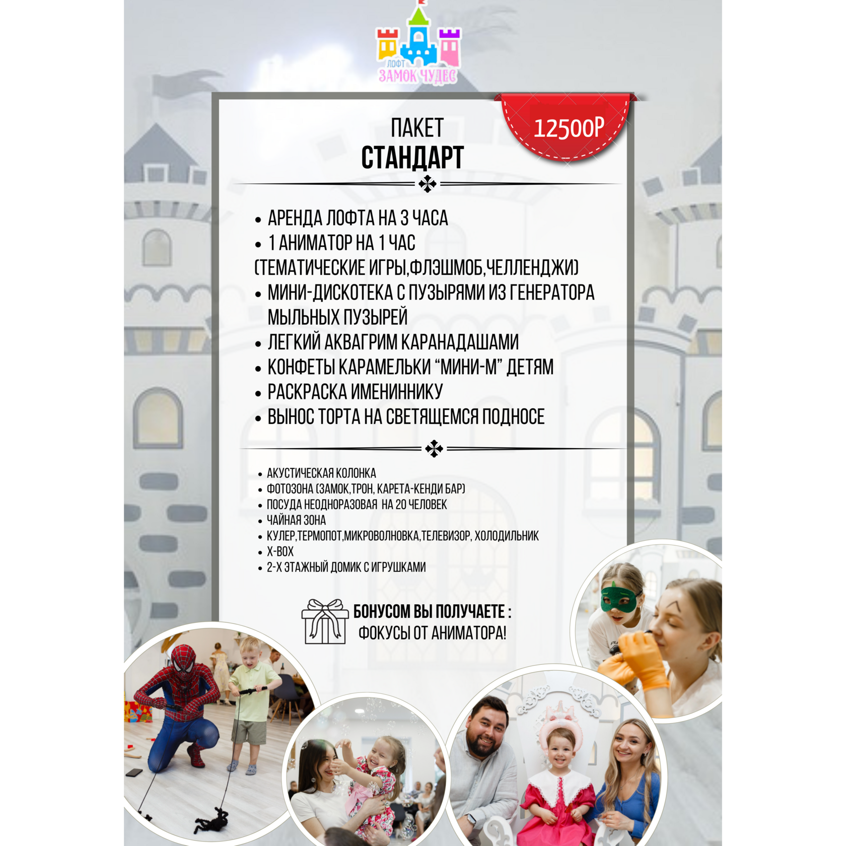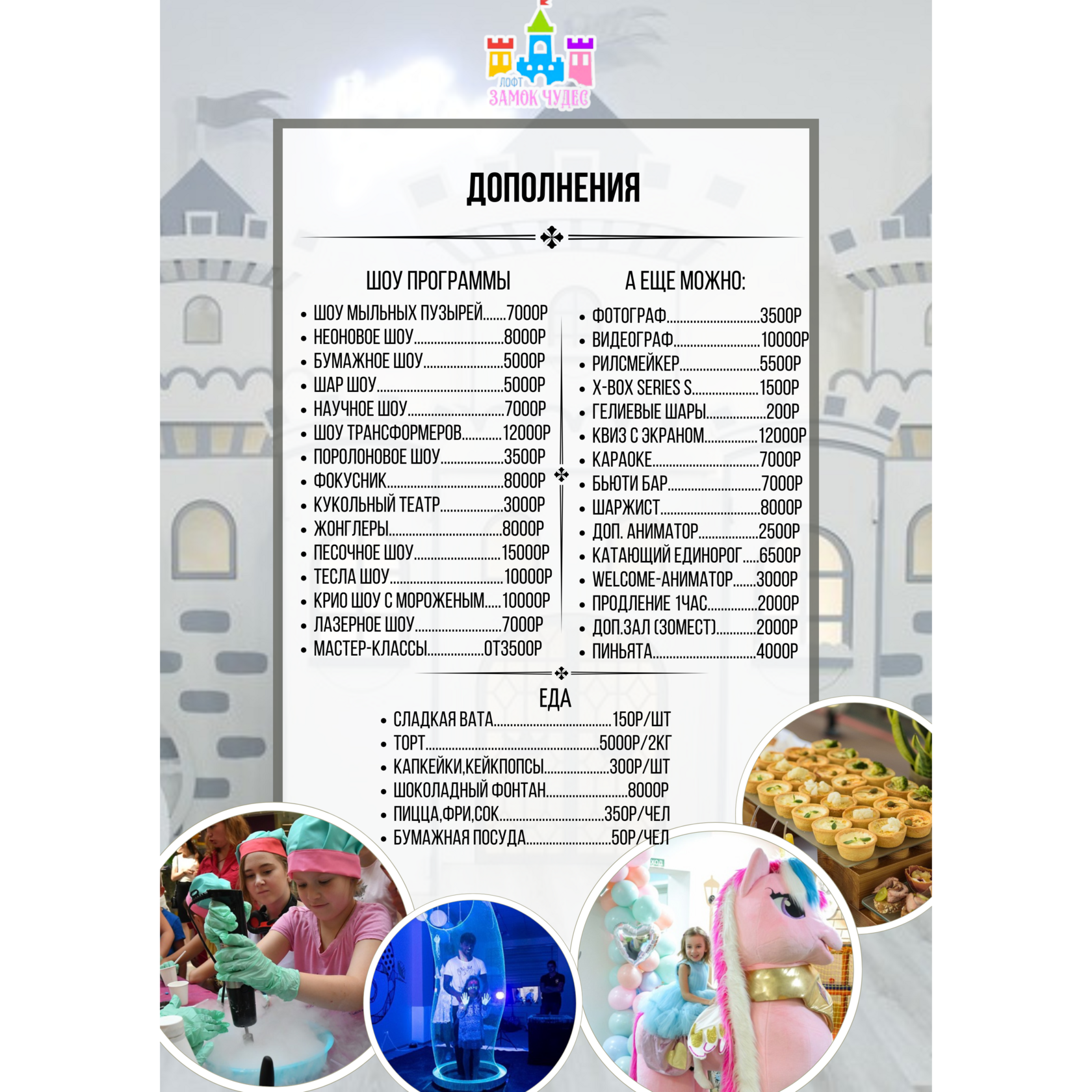 1. У нас разрешается: «Своя» еда и напитки, алкоголь в умеренных количествах, «свой» фотограф/видеограф/торт. Вы можете пригласить своего аниматора или артиста, цена минимальная в этом случае будет соответственно стоимости пакета Стандарт. Любые вышеперечисленные услуги Вы можете заказать также и у нас без дополнительных сборов.