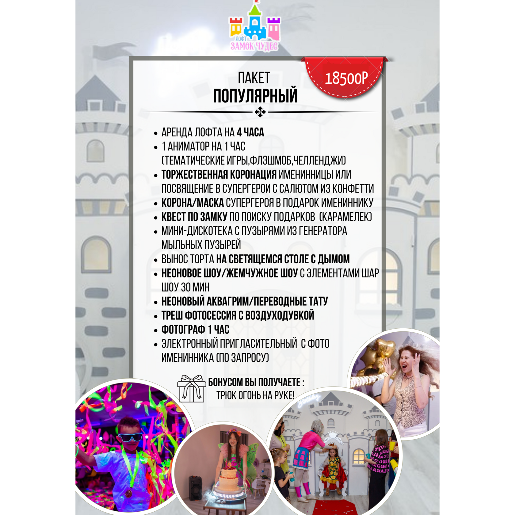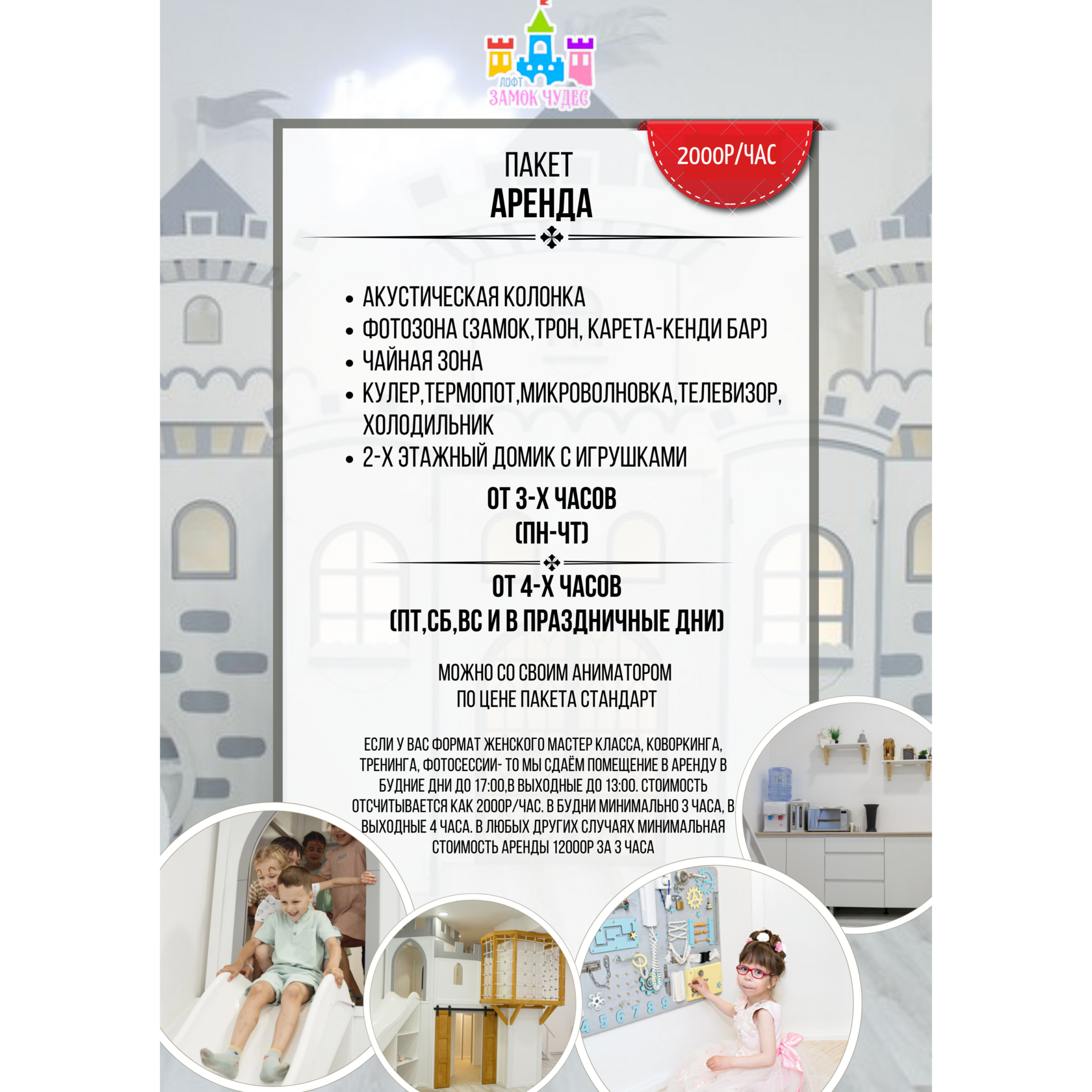 3. Все мероприятия в лофте проходят по предварительному бронировании и внесению предоплаты в размере 1000р. В случае отмены бронирования предоплата не возвращается. У вас есть возможность перенести один раз дату бронирования без удержания в течении одного месяца минимум за одну неделю. Лофт закрывается под Вас, других людей в пространстве не будет. Остаток оплаты за аренду лофта производится до начала бронирования на месте администратору.